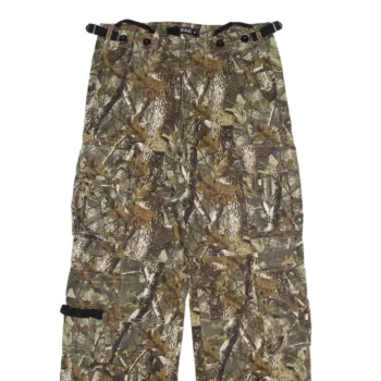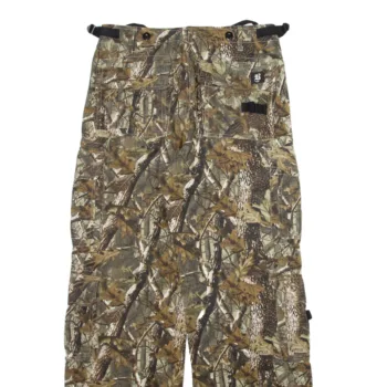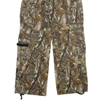 These are camouflage cargo pants designed for outdoor use. They feature a woodland camo pattern with shades of green, brown, and tan for blending into natural environments. The pants include multiple pockets for storage and adjustable straps at the waist and ankles for a secure fit. They are ideal for hiking, fishing, or other rugged outdoor activities.